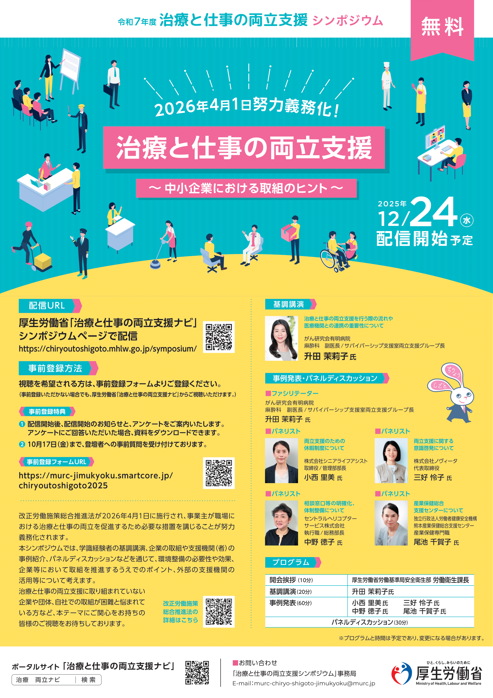 視聴を希望される方は、事前登録フォームよりご登録ください。(事前登録いただかない場合でも、厚生労働省「治療と仕事の両立支援ナビ」からご視聴いただけます。)